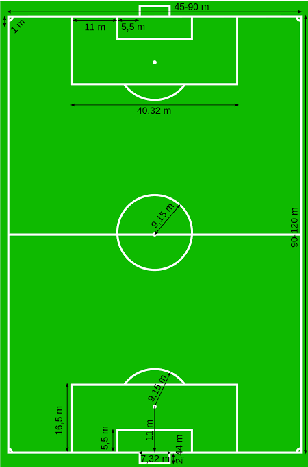 Las dimensiones de un campo de fútbol profesional, según la FIFA, varían entre 90 y 120 metros de largo, y entre 45 y 90 metros de ancho. Para partidos internacionales, las medidas suelen ser de 100 a 110 metros de largo y de 64 a 75 metros de ancho.